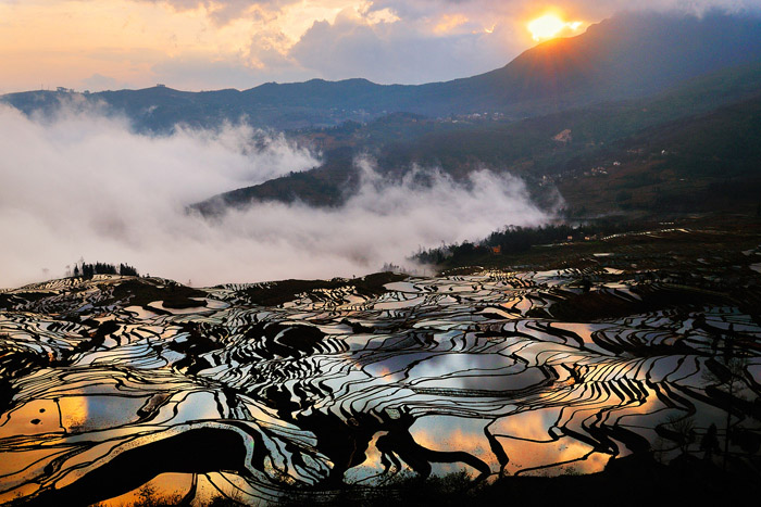 放眼梯田那优美的线条,折射出天空蓝色的水面、